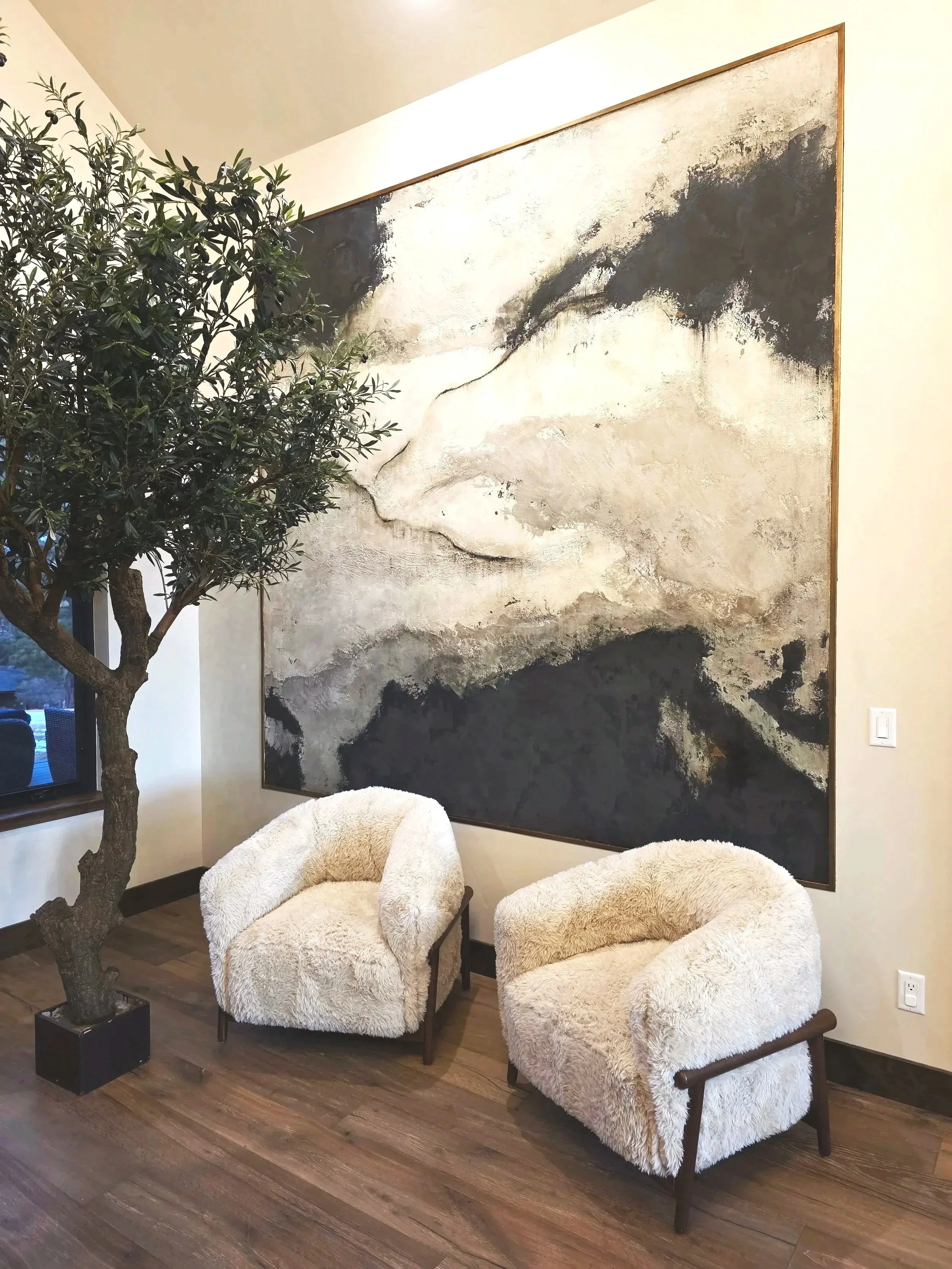 We create original works from canvas, to architectural installs, to one of a kind furniture pieces designed around our most signature finishes and looks. Those seeking something truly unique work with us to develop something truly special through commissions and design, or through our evolving body of work. Each piece is approached with a focus on material, scale, and atmosphere—resulting in artwork and interior elements that feel deeply considered, quietly striking, and entirely hand made.